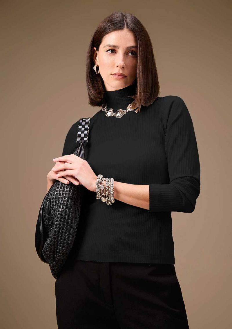 Eleve seu estilo com esta blusa elegante de gola alta e manga longa, um item essencial que combina tradição e modernidade. Com um padrão preto sofisticado, esta peça é perfeita para o outono/inverno, destacando sua presença em qualquer ocasião. Produzida com viscose e elastano, ela proporciona um caimento impecável e conforto absoluto. Combine-a com calças de alfaiataria e acessórios dourados para um visual elegante e marcante. Sinta-se confiante e sofisticada, refletindo a essência da coleção Maria.Valentina inspirada pela beleza italiana. Seja a protagonista do seu próprio estilo.