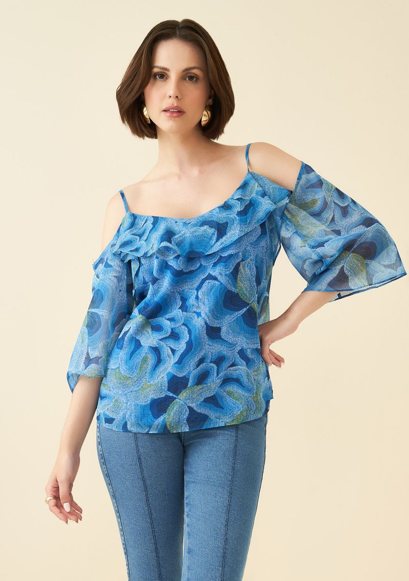 Blusa Maria.Valentina Decote V Manga Longa Ombro Caido Azul