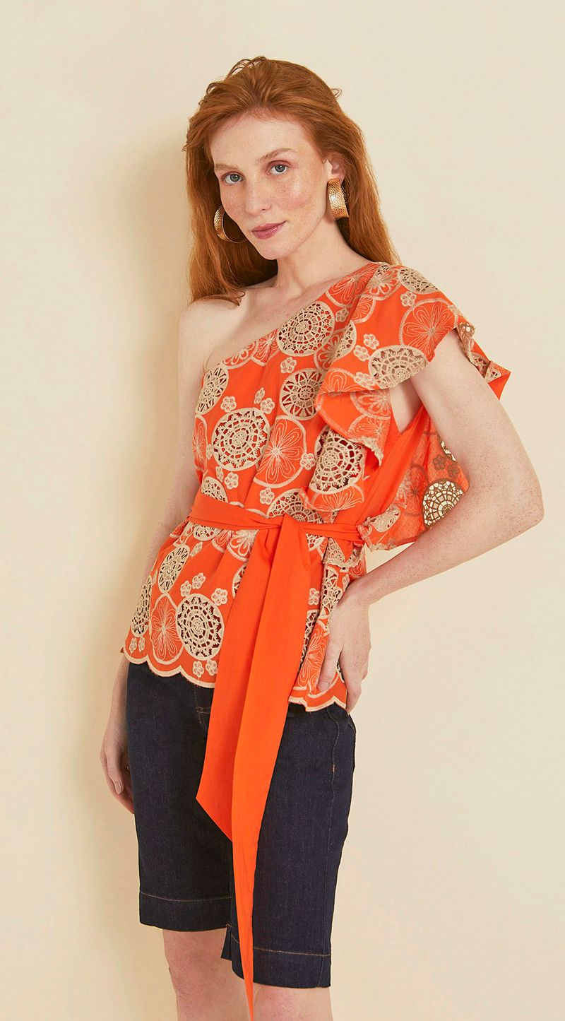 OUTLETRoupasBlusasBlusa Maria.Valentina Ombro Só Cavada Com Babado Laranja