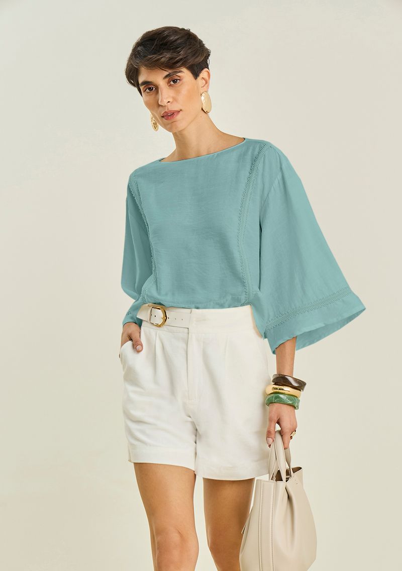 Blusa Maria.Valentina Solta Decote Careca Manga Longa Cropped Azul