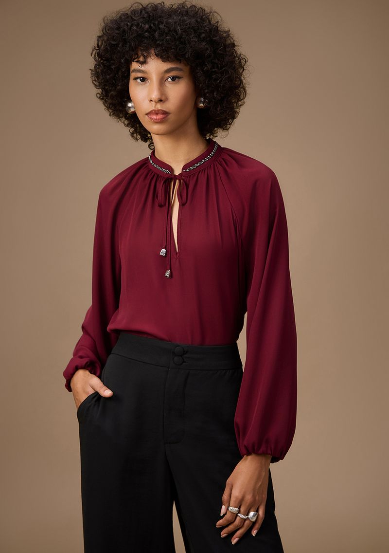 A blusa Maria.Valentina com decote careca e manga longa, em padrão bordo, é a escolha perfeita para a mulher moderna que busca sofisticação e versatilidade. Feita em crepe de poliéster, sua textura leve e caimento solto traduzem elegância e conforto. Ideal para transitar entre reuniões e jantares, pode ser combinada com saias lápis ou calças de alfaiataria. Complete o look com acessórios dourados para um toque de glamour. A coleção se inspira na arquitetura italiana, capturando a harmonia entre tradição e modernidade, e promete transformar seu dia a dia em uma experiência única. Sinta-se confiante e radiante com Maria.Valentina, refletindo seu estilo e essência.