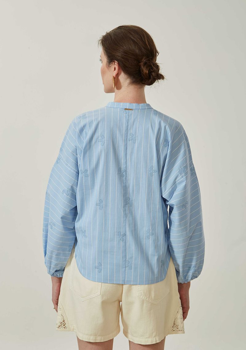 Eleve seu estilo com esta blusa de manga longa que combina sofisticação e conforto. O decote em V e o padrão azul vibrante fazem desta peça a escolha perfeita para ocasiões casuais. Feita em tricoline, a blusa apresenta um caimento impecável graças à composição de algodão, poliéster e elastano. Harmonize com calças de alfaiataria para o dia ou saias fluidas para a noite. Complemente com acessórios dourados e sinta-se confiante e elegante. Inspirada pelo legado visual da Maria.Valentina, esta peça é um tributo à feminilidade e ao estilo pessoal.