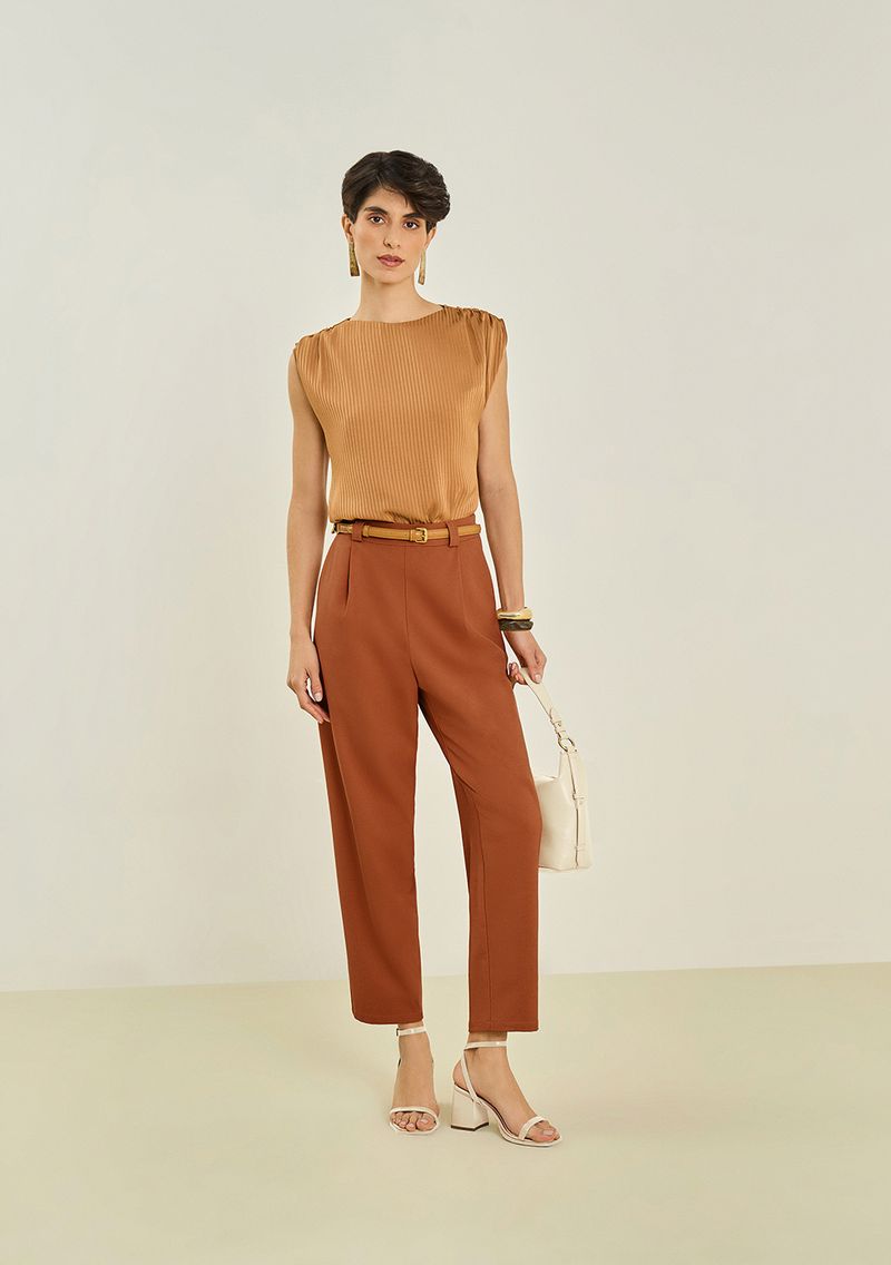 A calça de cintura alta em um tom marrom elegante é a peça perfeita para a mulher que busca unir conforto e estilo em suas produções. Composta por um crepe leve, que abraça suavemente o corpo, ela traz um caimento impecável e favorecedor. Ideal para compor looks casuais e sofisticados, pode ser combinada com uma blusa de seda e sandálias de tiras para um encontro especial, ou com uma t-shirt e tênis para um visual despojado e moderno. A versatilidade é a chave, permitindo criar diferentes combinações que refletem a sua autenticidade. A coleção Litorale, inspirada nas belezas do litoral italiano, traz a essência vibrante e criativa da mulher contemporânea, perfeita para brilhar em qualquer ocasião.