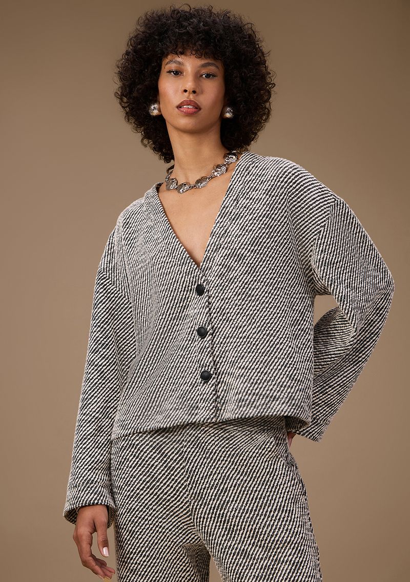 Envolva-se na sofisticação e praticidade do casaco Maria.Valentina. Com mangas longas e padrão elegante em preto, é a peça-chave que eleva seu estilo em qualquer ocasião. Feito de tweed, com 85% poliéster e 15% elastano, proporciona conforto e elegância em dias mais frios. Perfeito para um jantar especial ou uma reunião importante, combine com calças de alfaiataria e acessórios discretos. Sinta o toque da moda italiana na coleção inspirada na arquitetura de Veneza, onde tradição e modernidade se encontram. Adicione um toque de elegância ao seu guarda-roupa e destaque-se com confiança e charme.