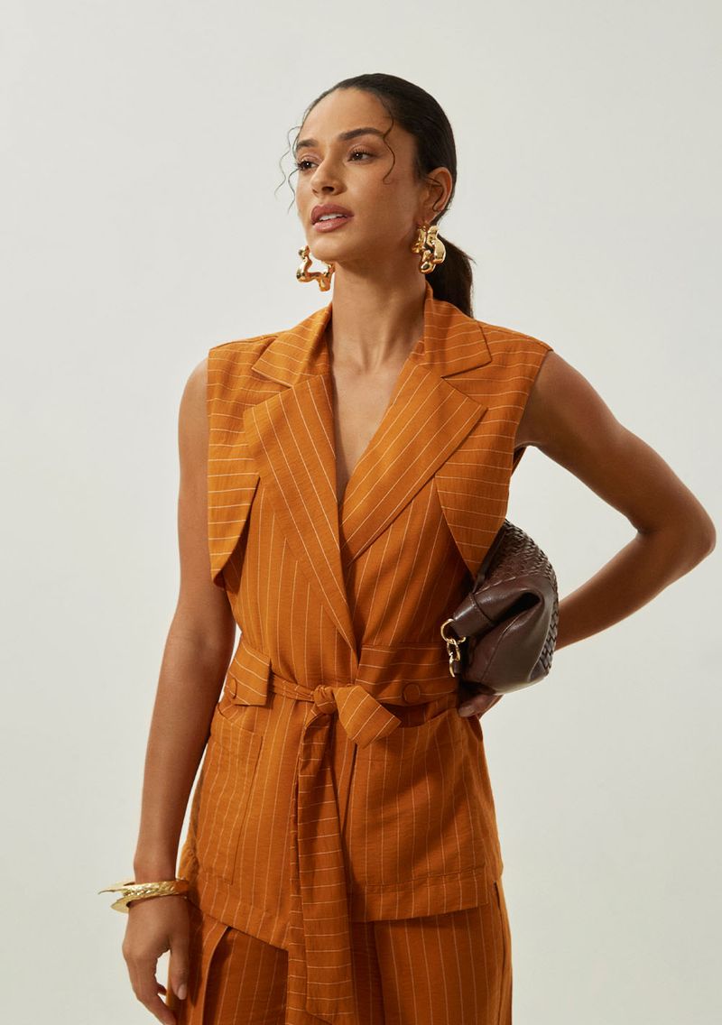 Eleve seu estilo com a peça essencial que une sofisticação e versatilidade: este colete alongado marrom da Maria.Valentina. Com um corte ajustado que valoriza a silhueta, ele é confeccionado em uma mistura de viscose, poliamida e elastano, garantindo conforto e caimento perfeito. Ideal para transitar entre o casual e o elegante, combina perfeitamente com blusas estampadas ou básicas e calças de alfaiataria. Aposte em acessórios discretos para um visual atemporal e marcante. Este colete é parte de uma coleção que homenageia memórias através de design sofisticado, perfeito para mulheres que buscam afirmar sua presença com elegância e confiança.