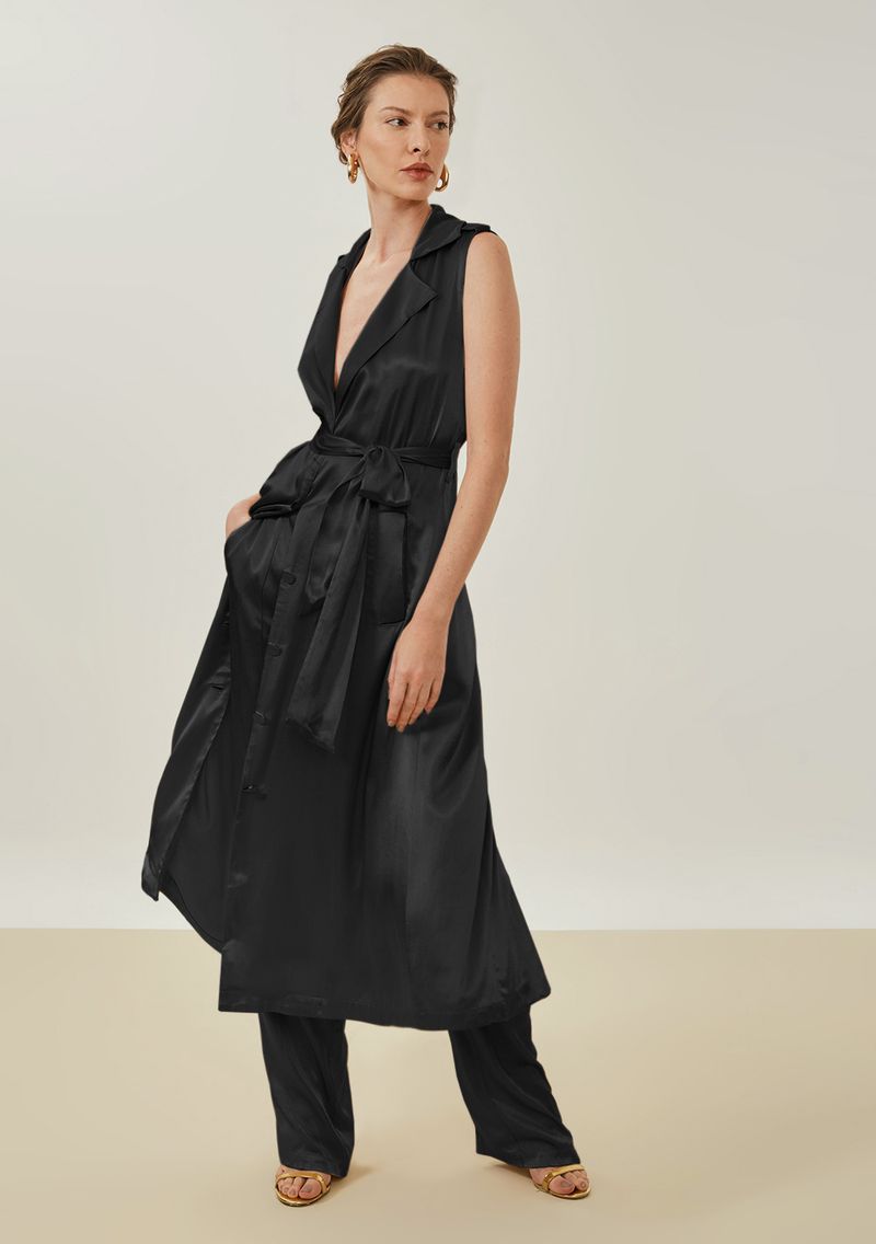 Transforme seu estilo com um toque de sofisticação atemporal. Este colete preto, sem mangas e alongado, é a peça ideal para mulheres que buscam elegância e versatilidade. Confeccionado em 100% viscose, traz leveza e conforto para qualquer ocasião, seja uma reunião importante ou um jantar especial. Combine-o com uma blusa estampada e calça de alfaiataria para um visual marcante, ou opte por um look casual-chic com jeans e camiseta básica. Sinta-se poderosa e confiante ao incorporar essa peça da coleção Maria.Valentina, que celebra a riqueza cultural e a brasilidade com design refinado. Aposte em acessórios discretos para realçar ainda mais sua presença.