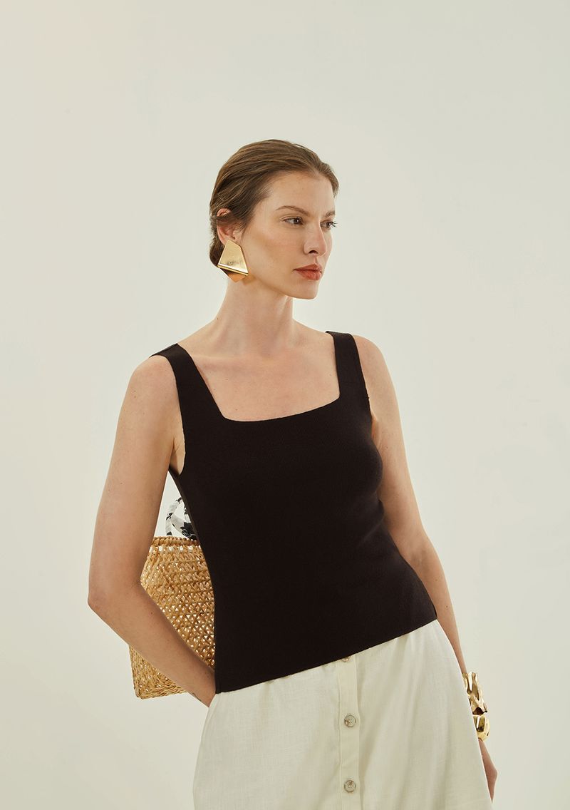 Envolva-se no charme atemporal da regata Maria.Valentina, com decote quadrado em um elegante padrão preto. Perfeita para a mulher moderna, sua modelagem ajustada realça a silhueta, enquanto a composição em viscose, elastano e outras fibras garante conforto e caimento impecável. Ideal para ocasiões que vão do casual ao refinado, combine-a com uma calça de alfaiataria para o trabalho ou uma saia midi para um jantar especial. A essência da sofisticação está aqui, convidando você a brilhar com estilo e confiança.