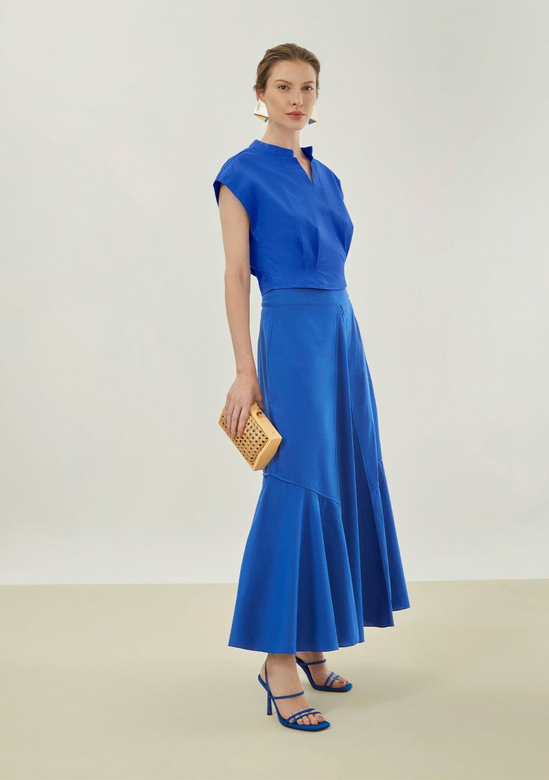 A elegância atemporal ganha vida nesta saia midi azul de cintura alta da Maria.Valentina. Com modelagem evasê e confeccionada em tricoline 100% algodão, ela oferece frescor e sofisticação perfeitos para a primavera/verão. Combine com uma blusa de seda e sandálias de salto para um visual de trabalho, ou com uma camiseta básica e tênis para um passeio casual. Sua essência reflete a mulher moderna que transita entre o casual e o elegante com autoconfiança.