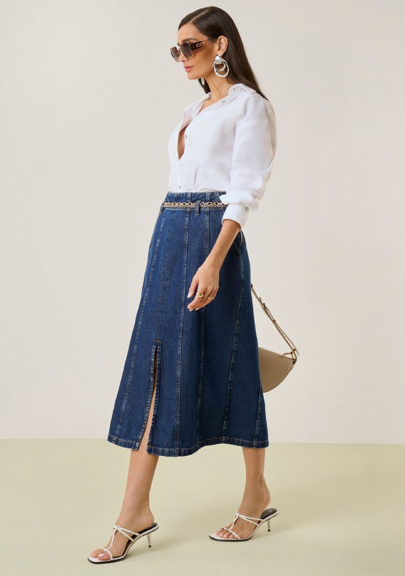 Envolva-se na sofisticação com esta saia midi azul de cintura alta, um tributo à elegância atemporal. Com um corte evasê que favorece qualquer silhueta, ela é confeccionada em jeans de alta qualidade, proporcionando conforto e estilo. Perfeita para ocasiões casuais, combine-a com uma blusa leve e sandálias para um look de verão irresistível. Inspirada nos verões italianos, esta peça da coleção Pellicola da Maria.Valentina captura a essência da simplicidade e do charme europeu. A escolha ideal para mulheres que buscam expressar seu sucesso e bom gosto através da moda.