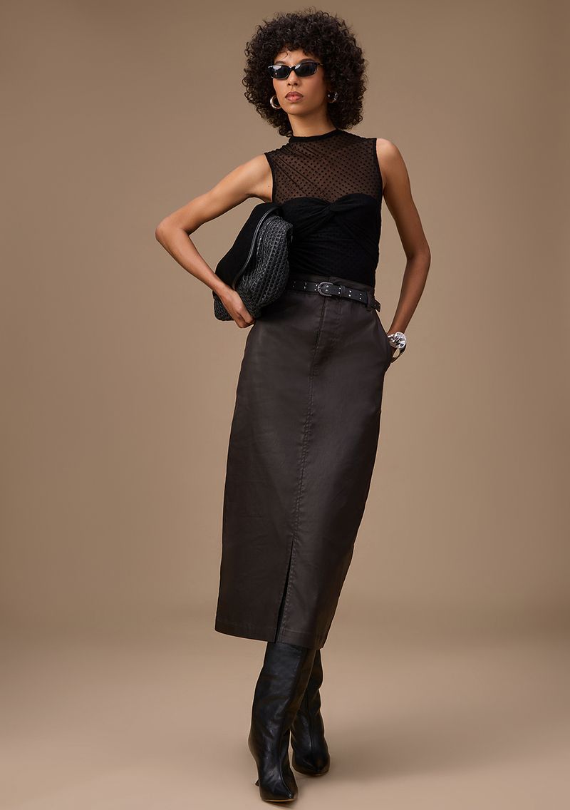 Envolva-se na sofisticação atemporal com esta saia lápis midi Maria.Valentina, em preto clássico. Feita de sarja de alta qualidade com algodão, poliéster e elastano, ela oferece conforto e elegância em cada detalhe. A cintura alta garante um caimento perfeito, ideal para eventos noturnos ou reuniões de trabalho. Combine com uma blusa de seda e saltos para um visual refinado ou opte por um suéter leve e botas para um look casual-chic. Parte da coleção inspirada na arquitetura italiana, esta peça é um convite para sentir-se confiante e poderosa a cada passo.