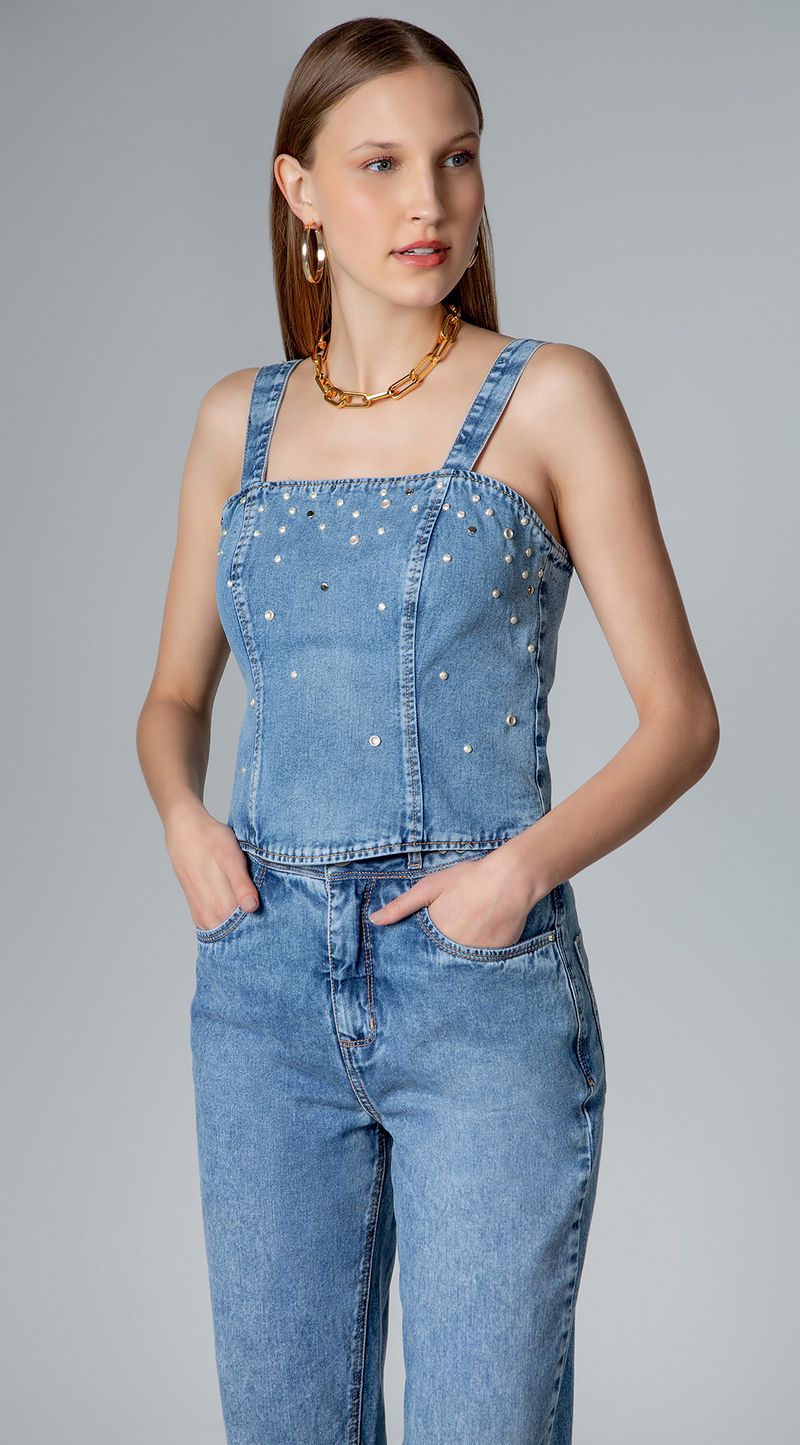OUTLETRoupasBlusasTop Maria.Valentina Justo Alça Detalhe Tachas Jeans