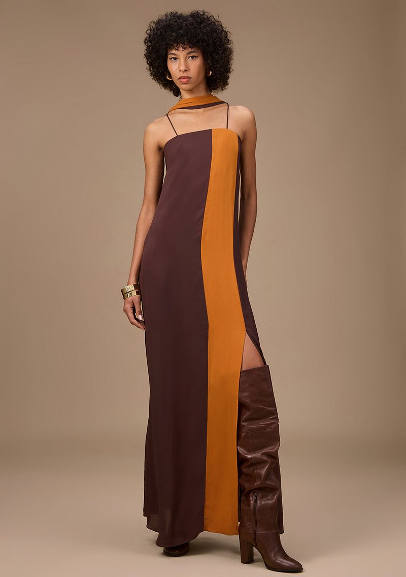 Um verdadeiro ícone de sofisticação, este vestido longo em chiffon marrom é a escolha perfeita para mulheres que valorizam elegância e praticidade. Com decote reto e alças delicadas, ele abraça suavemente o corpo, destacando sua silhueta com charme e confiança. Ideal para ocasiões que vão do casual ao elegante, esse vestido é um coringa para o closet. Combine-o com um casaco leve em dias mais frios ou acessórios dourados para um toque de glamour. Parte da coleção que celebra a harmonia entre tradição e modernidade, ele traduz o calor das fachadas italianas em um visual atemporal. Sinta-se poderosa e radiante em cada momento especial.