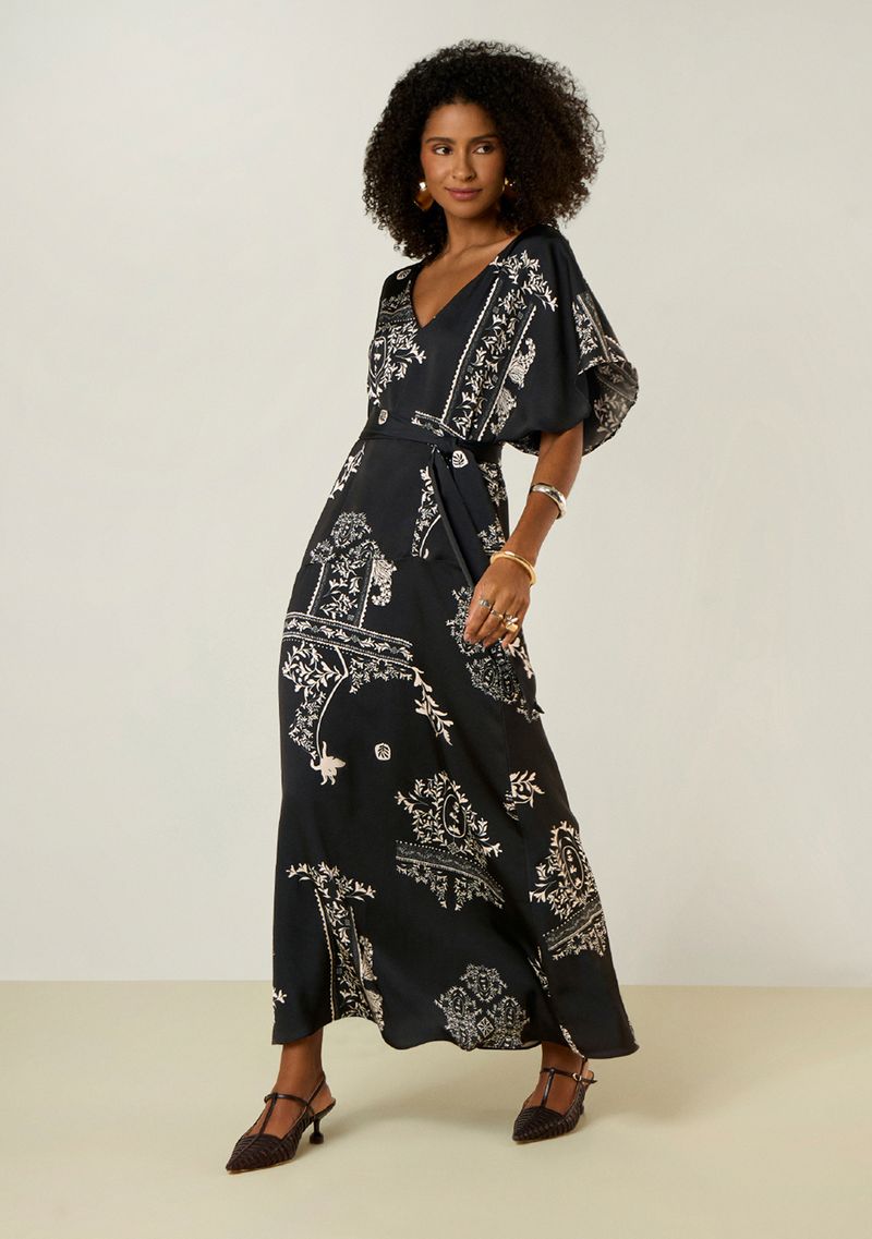 A peça essencial para o guarda-roupa da mulher moderna, este vestido longo em cetim preto da Maria.Valentina é a combinação perfeita de praticidade e elegância. Com um caimento impecável e decote V que valoriza a silhueta, ele é ideal para ocasiões que vão do casual ao sofisticado. Use-o com um colar delicado e saltos para um jantar especial, ou adicione um blazer para um look de trabalho elegante.