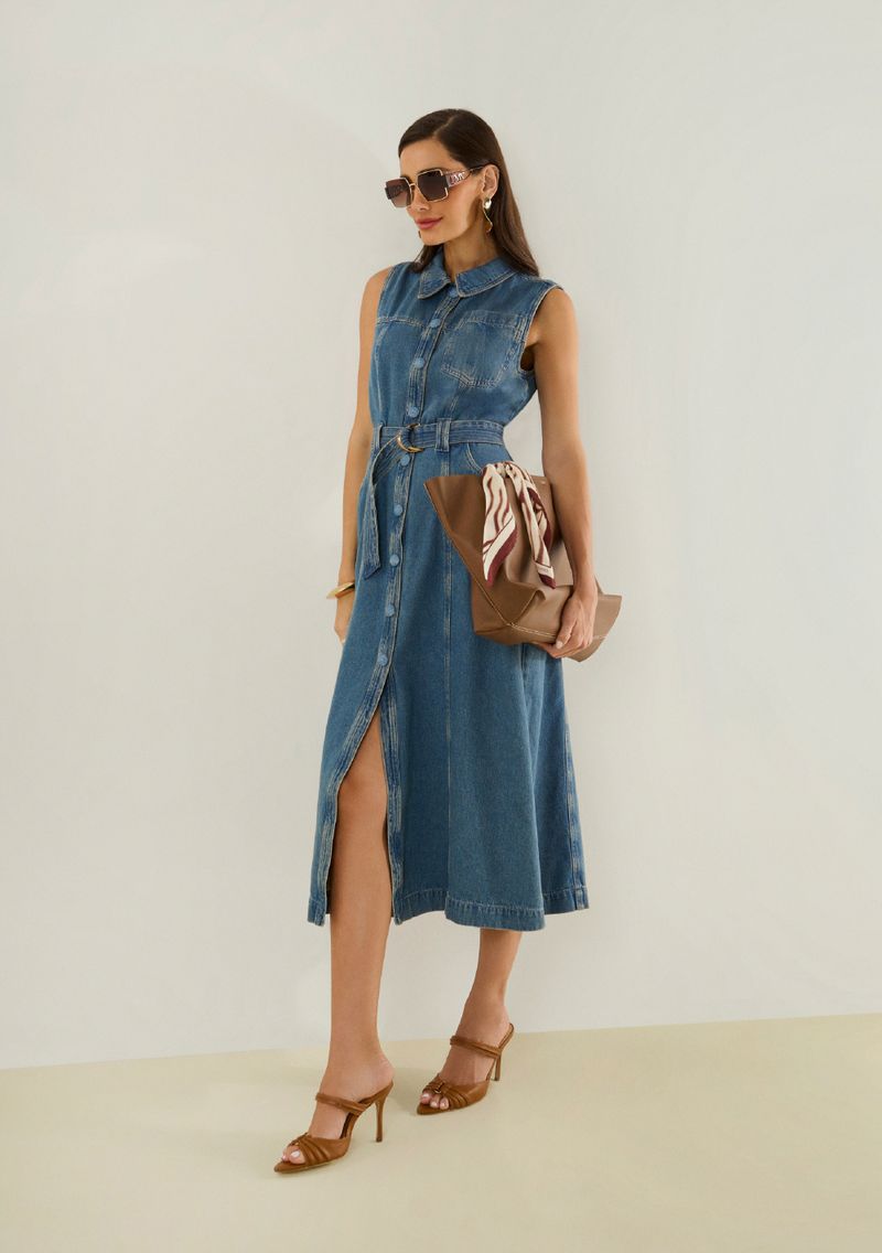Vestido Maria.Valentina Ajustado Gola Clássica Sem Manga Midi Azul