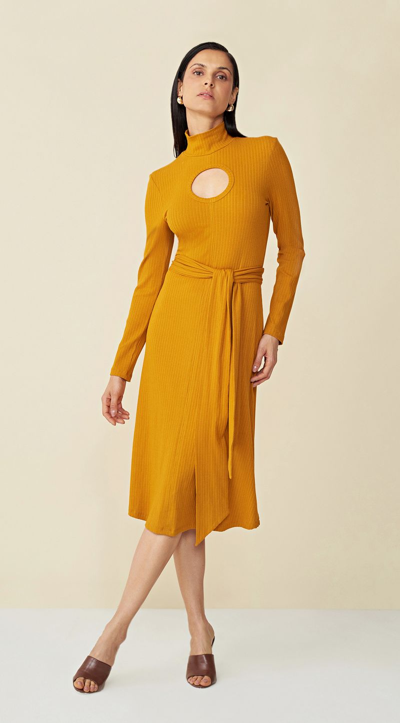 Vestido Maria.Valentina Midi Gola Alta Com Faixa Amarelo