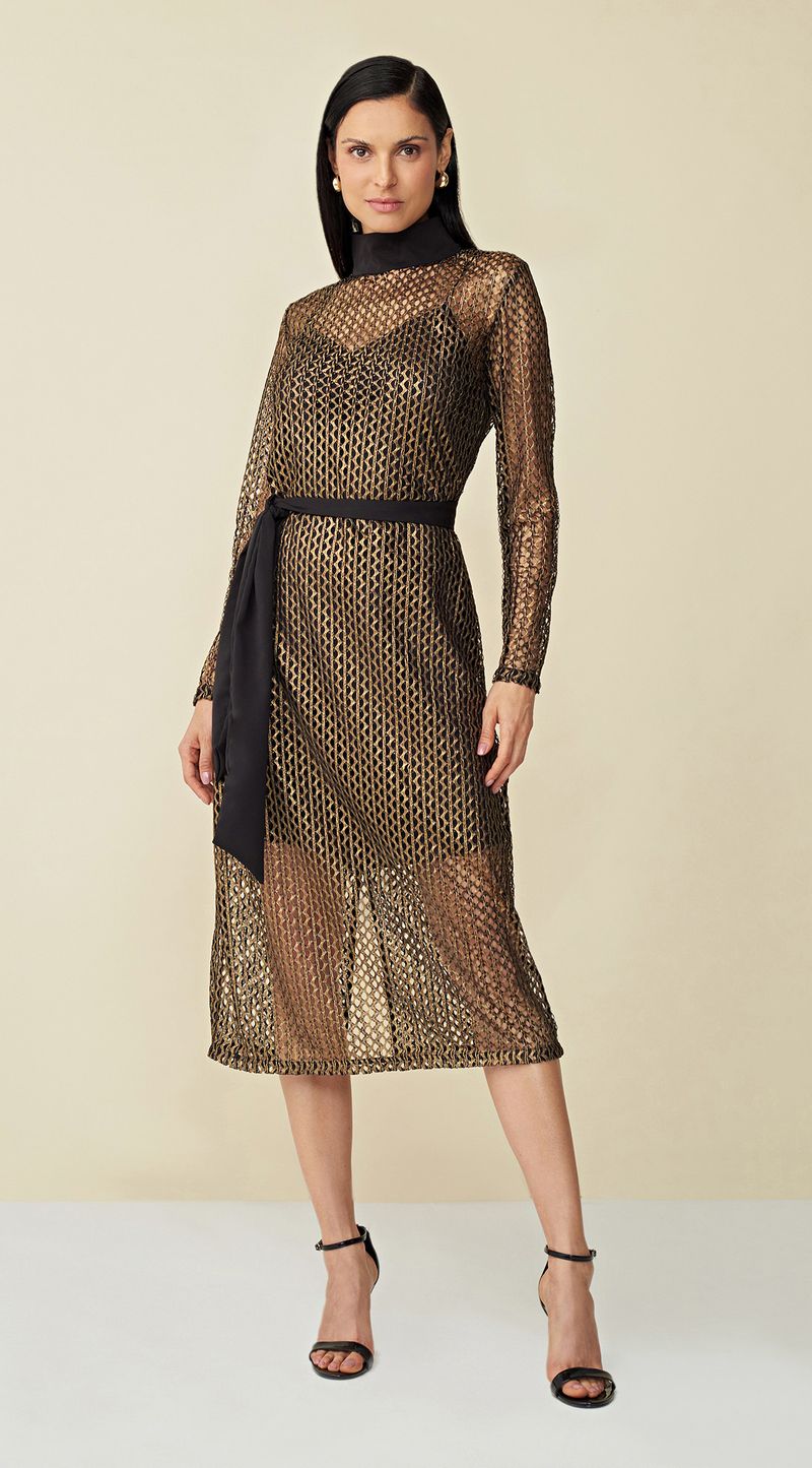 Vestido Maria.Valentina Midi Gola Alta Com Faixa Dourado
