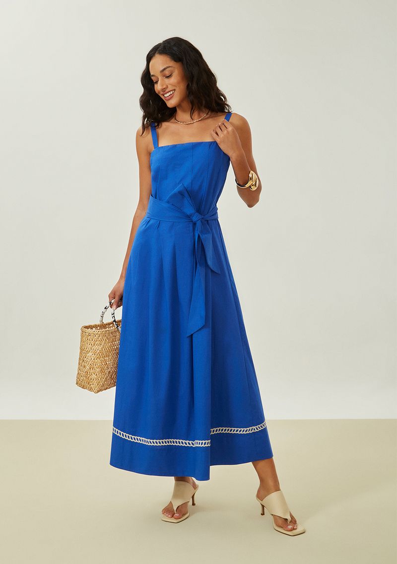 O vestido midi azul da Maria.Valentina é a epítome da sofisticação e versatilidade. Com um decote reto e sem mangas, essa peça confeccionada em algodão 100% é ideal para os dias quentes da primavera e verão. Seu corte solto proporciona um caimento fluido e confortável, perfeito para mulheres que buscam elegância com praticidade. Combine-o com sandálias de tiras finas para um evento casual chic ou com um elegante colar de pérolas para um jantar especial. Seja em uma reunião de trabalho ou em uma festa descontraída, este vestido é um aliado de estilo que valoriza sua essência e ilumina sua presença.