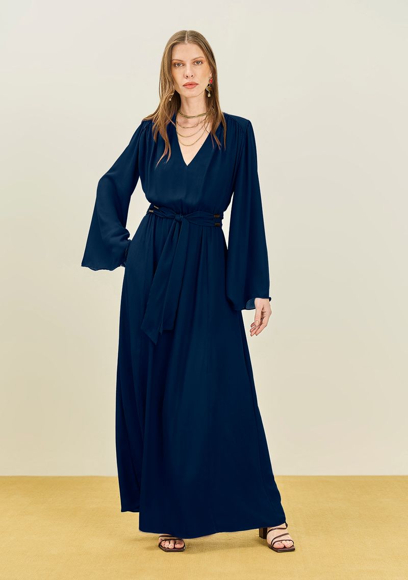 Vestido Maria.Valentina Solto Decote V Manga Longa Longo Azul Escuro
